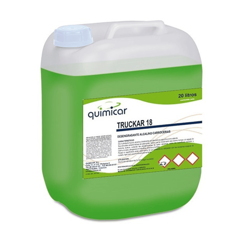 TRUCKAR 18 es un desengrasante alcalino de acción enérgica, formulado para desprender grasas, aceites e hidrocarburos muy incrustados. Su alto poder emulsionante permite que la suciedad se rompa y se retire con facilidad, reduciendo el esfuerzo mecánico y el tiempo de trabajo.