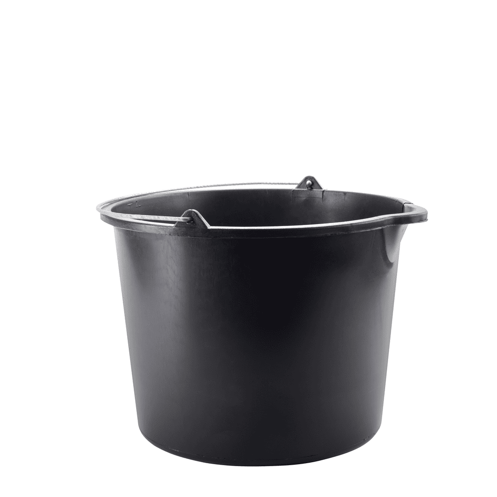 Cubo de construcción de 12 litros con boquilla antiderrame, base reforzada y asa galvanizada. Fabricado en plástico reciclado, resistente a golpes y carga, útil para obra, mezclas, transporte de material o uso en jardinería y ganadería.