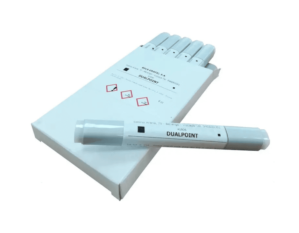 Rotulador de corrección DUALPOINT de doble punta (fina y gruesa) para planchas positivas convencionales y CTP. Permite eliminar áreas impresas no deseadas, desde zonas amplias hasta pequeños detalles, dejando la plancha preparada para una correcta aceptación de agua.
