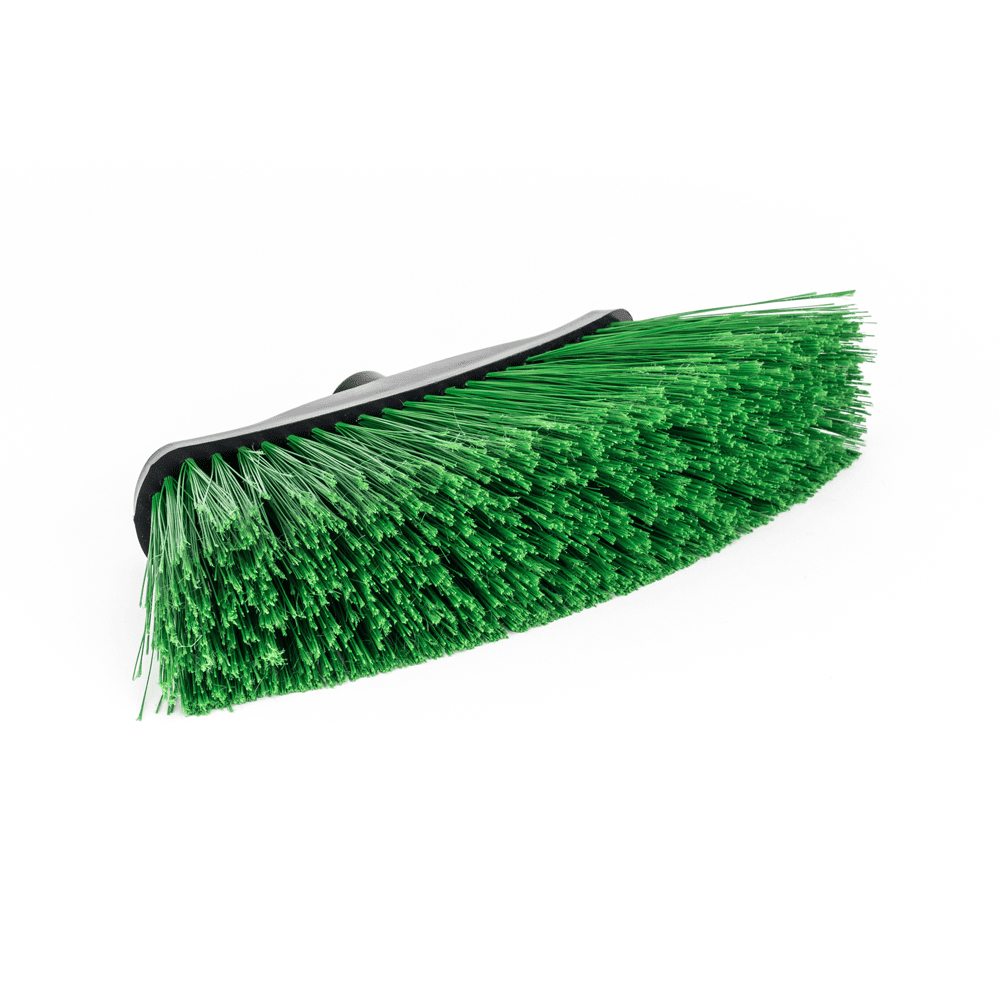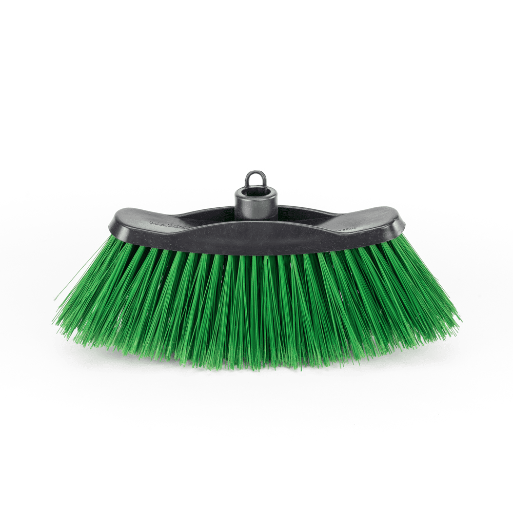 Escoba curva con soporte de polipropileno y fibra PVC plumada intermedia. Buena captación de polvo fino y mejor acceso a rincones. Compatible con mango Ø22 mm.