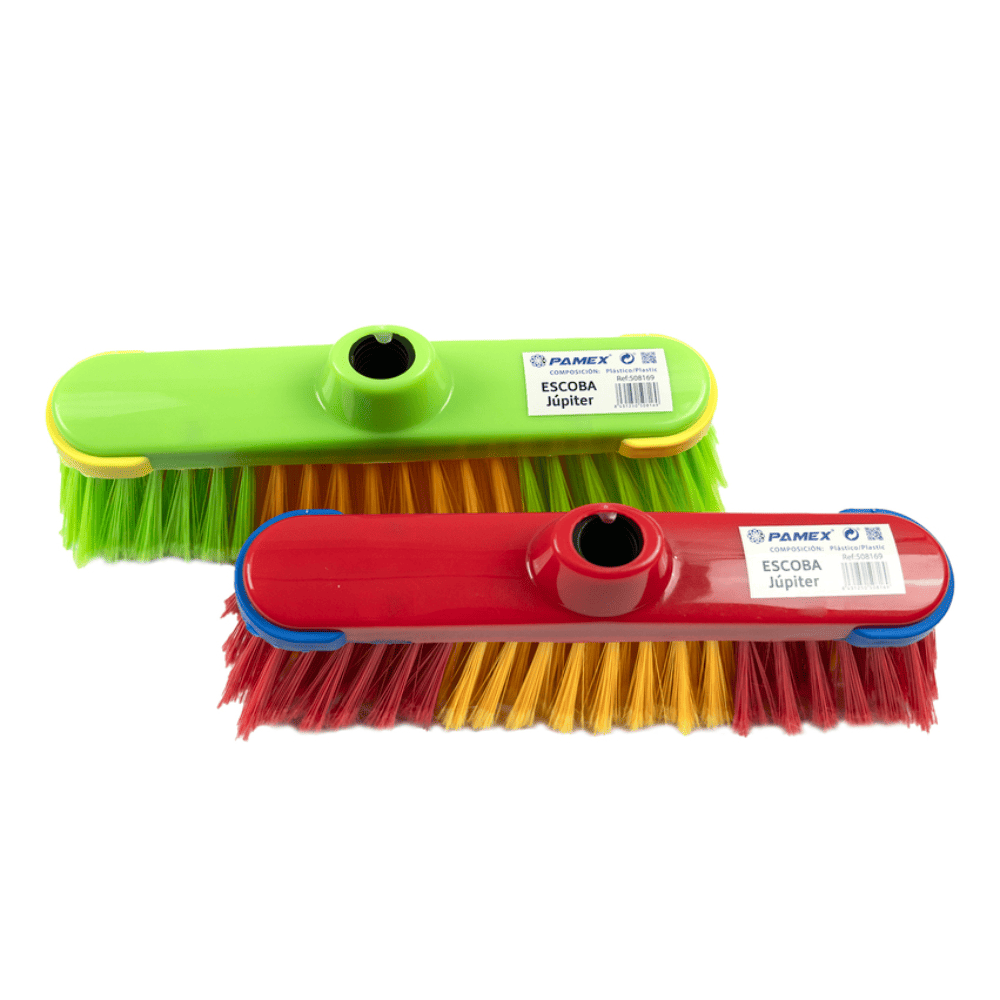 Escoba Júpiter ligera con cerda sintética flexible y base plástica. Adecuada para barrido diario en interiores y tareas de mantenimiento general.