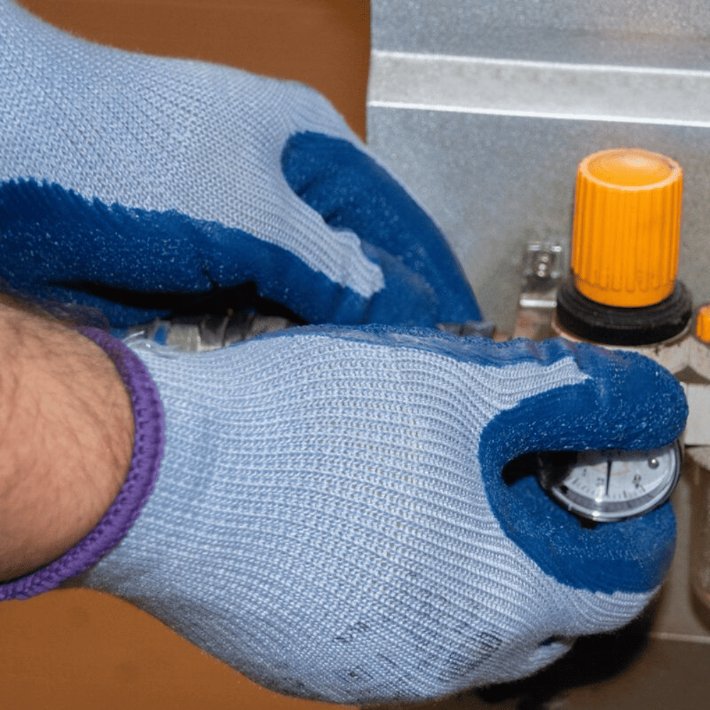 Guante con dorso de poliéster y algodón y baño de látex rugoso en la palma. El tejido del dorso aporta comodidad y cierta transpirabilidad, mientras que el recubrimiento de látex mejora claramente el agarre y la resistencia al desgaste.