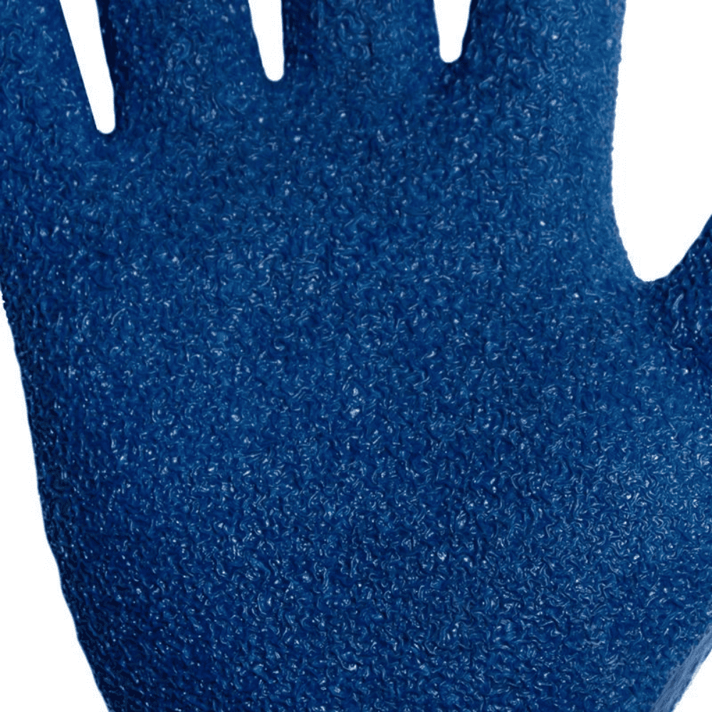Guante de trabajo con dorso de poliéster y algodón y palma de látex rugoso para mejor agarre y resistencia al desgaste. Cumple EN 388 3132X para riesgos mecánicos moderados y está indicado para manipulación general y trabajos en entornos fríos. Se suministra por 1 par y disponible en tallas XS a XXL.
