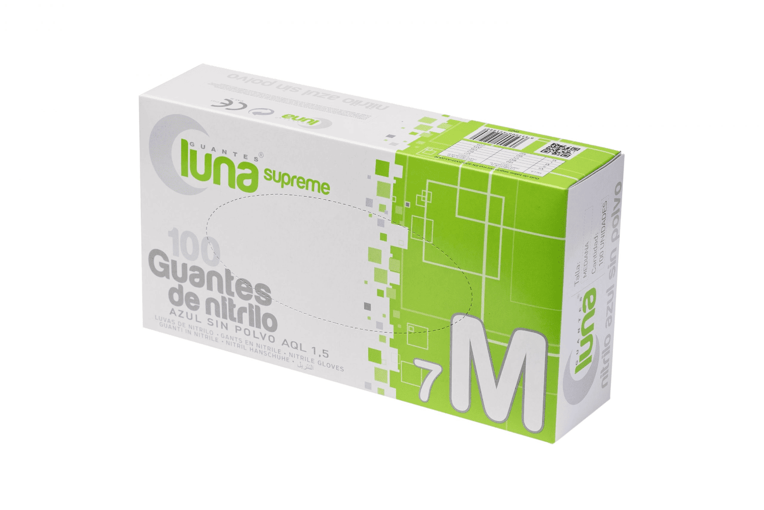 Guante desechable de nitrilo 100%, libre de látex y sin polvo, ambidiestro y de color azul. Está clasificado como EPI Categoría III y Producto Sanitario Clase I, lo que lo hace válido tanto para uso industrial como sanitario y alimentario.