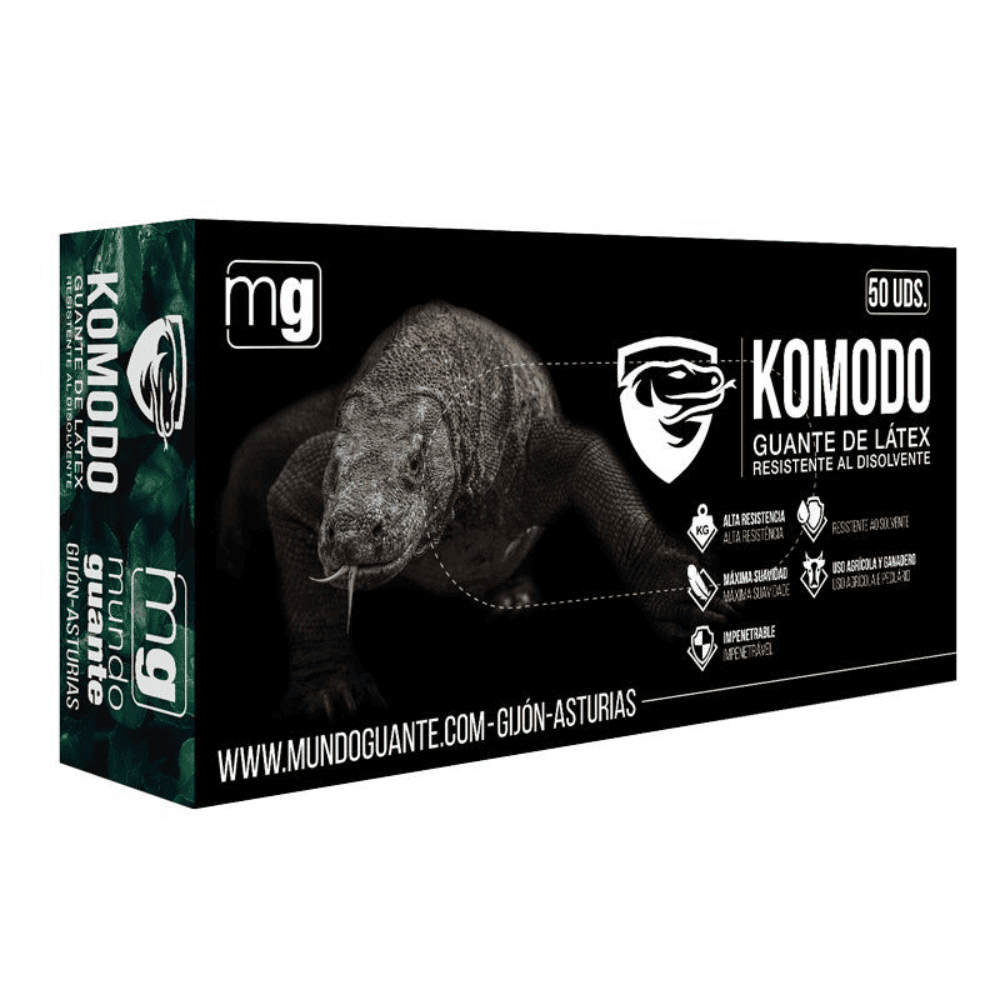 Guante de látex natural texturizado Komodo de 300 mm de longitud, ambidiestro y CAT III para uso químico e industrial exigente. Ofrece resistencia certificada frente a diversos productos químicos y protección contra microorganismos. Apto para contacto alimentario y con AQL 1.5. Dispensador de 50 unidades, disponible en tallas XS a XL.