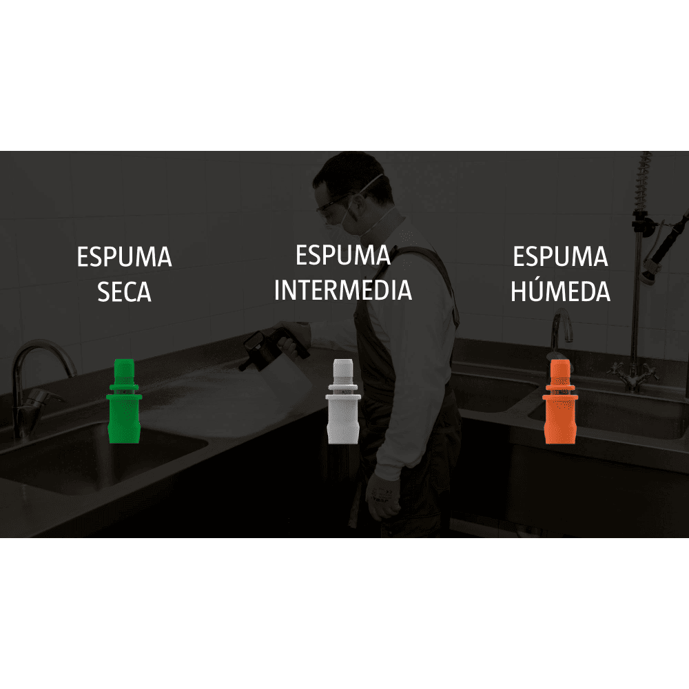 Incluye tres mezcladores intercambiables (naranja, gris y verde) que permiten variar el tipo de espuma según el trabajo:
